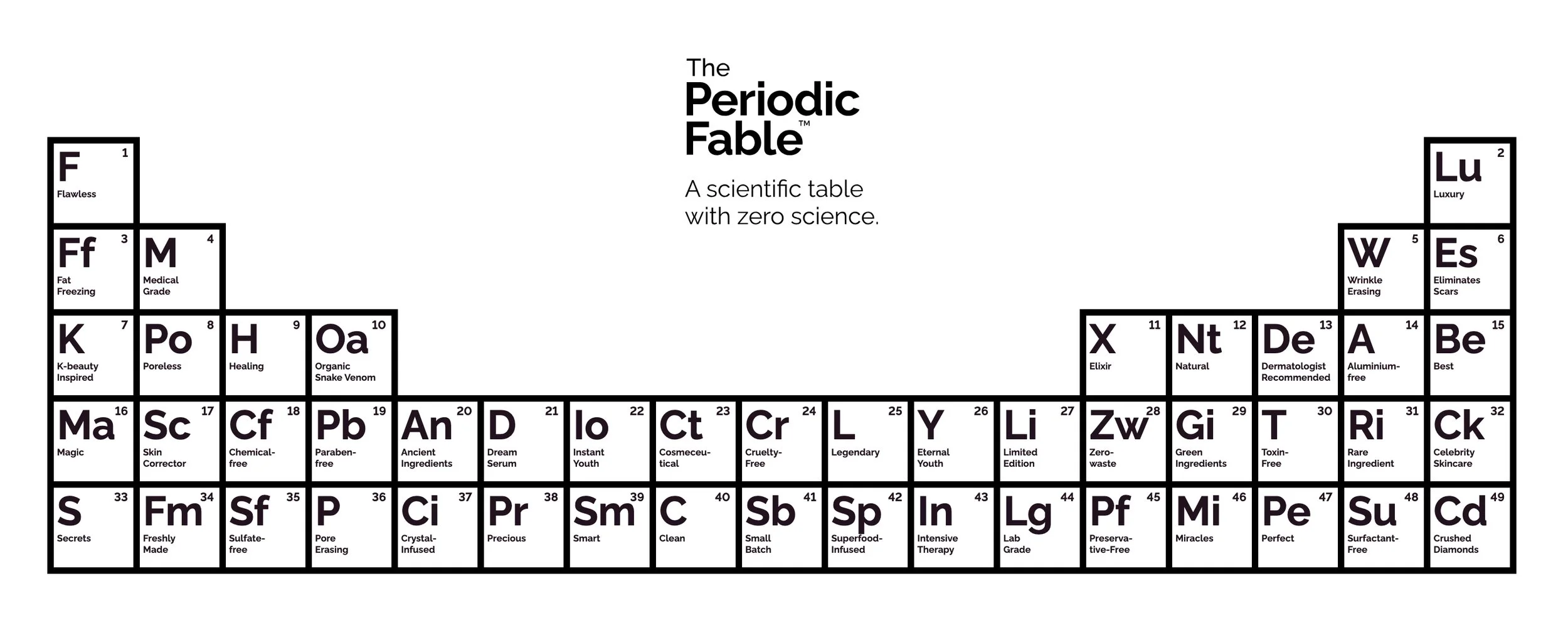 Forget “Transparency.” The Ordinary just took a microscope to the beauty industry’s favorite lies and published the receipts in black and white. Their latest project, The Periodic Fable™, looks like chemistry class but feels like rebellion: 49 squares, each exposing a marketing myth. From “Chemical-Free” to “Luxury,” “Pore-Erasing” to “Instant Youth,” it’s the beauty world’s fake science laid out on a lab table. Brutally simple. No filters. Just truth and shade.